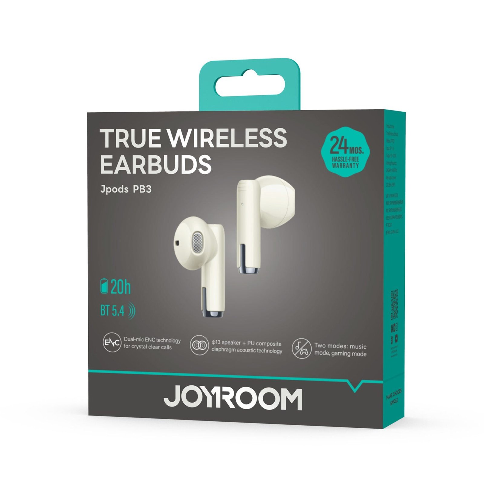 JOYROOM Jpods JR-PB3 True Wireless Earbuds, BT version: V5.4, Audio codec format: AAC, SBC, BT range: 10m, Water resistance: IPX5, Playtime: about 5-6h (70% volume), Battery life with charging case: 20h, Calling time: about 2h (90% volume), Battery capacity: 25mAh (earphones)/300mAh (charging case), Charging time: about 1.5h, Charging input: 5V⎓1A, Charging port: Type-C, Frequency response: 20Hz-20KHz, Speaker size: Ф13mm